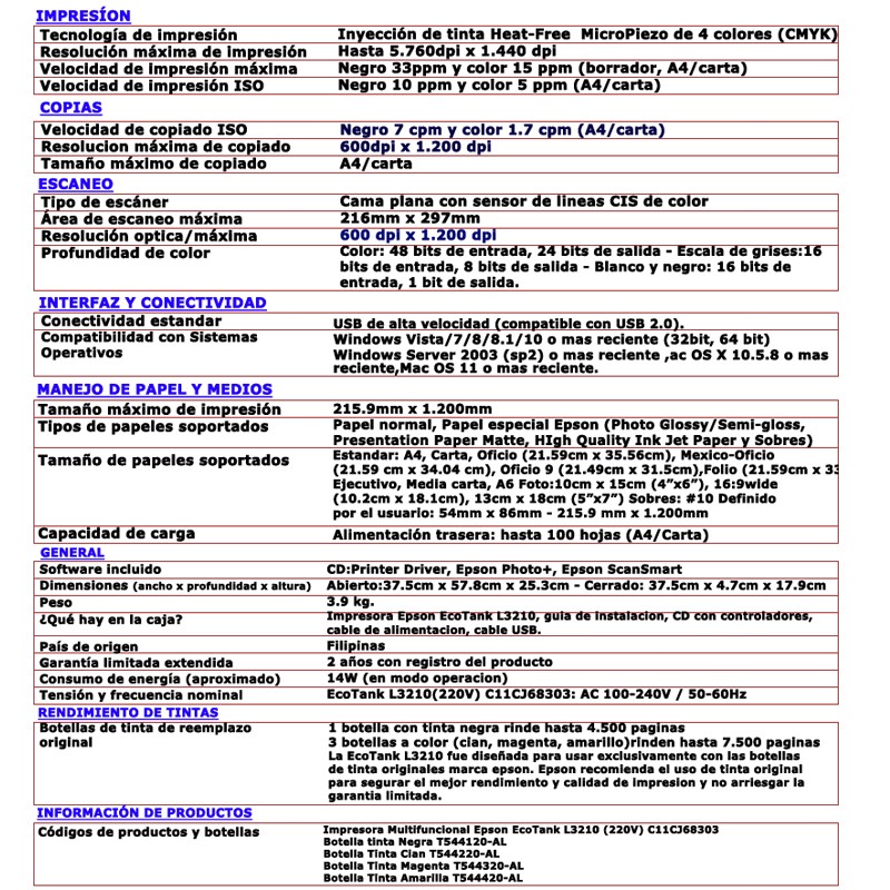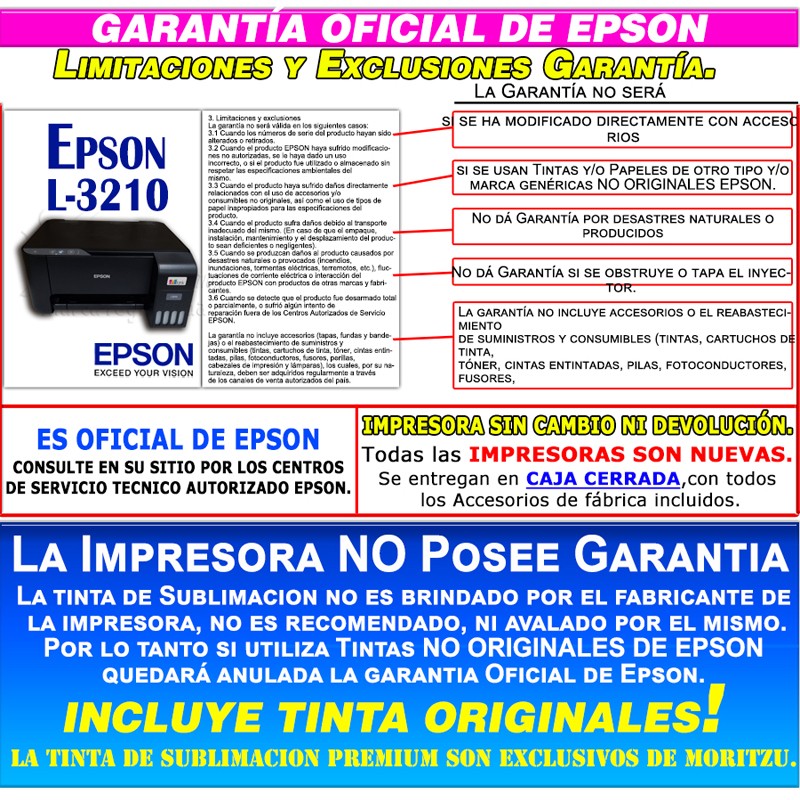 - LIMITACIONES Y EXCLUSIONES DE LA GARANTÍA. Leer dentro de la garantía oficial de Epson. A continuación se transcribe los más resaltantes.