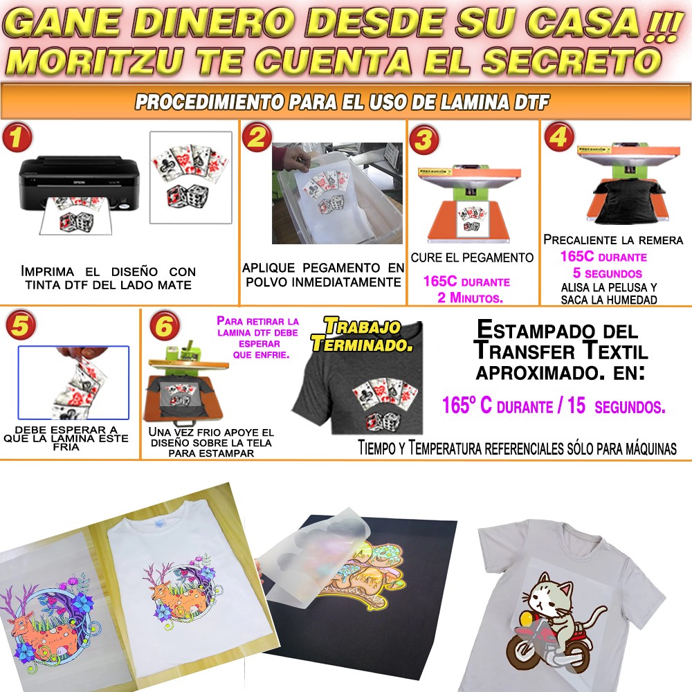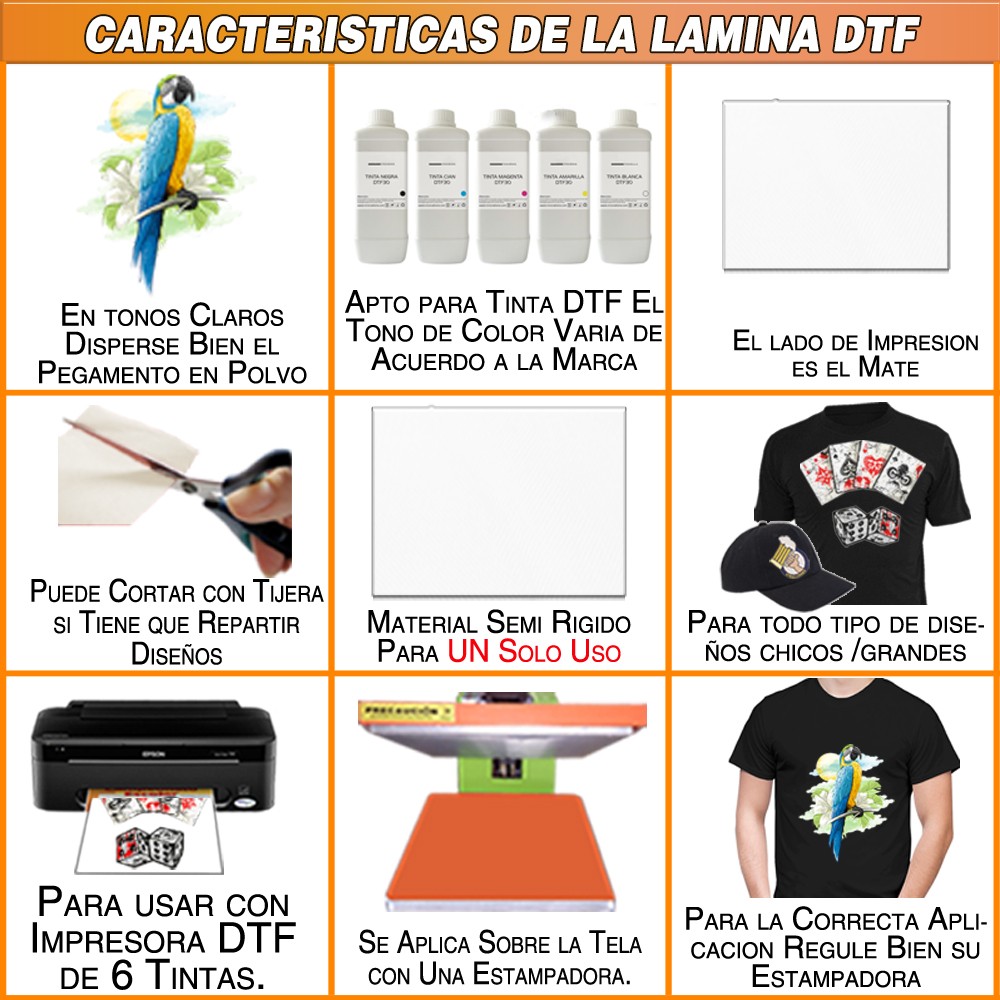MODELO: DTF Tamaños A3 * CALIDAD PREMIUM. * APTO PARA USAR CON SUBLIPOLVO O POLIAMIDA. * COMPATIBLE CON IMPRESORAS DTF. * PAQUETE DE 50  HOJAS TAMAÑO A3 * FILM DEBE RETIRARSE EN FRIÓ DESPUÉS DEL PLANCHADO. * Cara a imprimir es el lado MATE. DETALLES A TOMAR EN CUENTA -Tiene que imprimir todos los días con su impresora de tinta DTF. -La tecnología de DTF usa tinta blanca y la misma es muy espeso y engomado, -Una vez tapada el cabezal difícilmente se puede destapar porque  no existe solución que disuelva la tinta engomada. -La impresora al no estar fabricada para usar tinta blanca densa engomada automaticamente pierde la garantia. -Si se le tapa la impresora debe ser desechado porque el fabricante no vede repuestos.