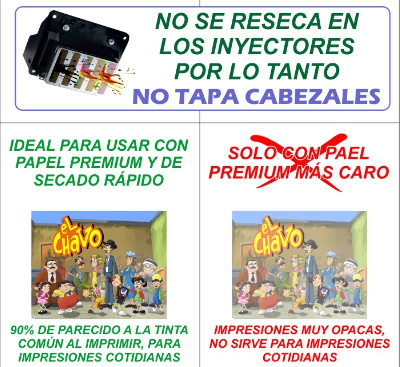 - La tinta koreana tiene mayor viscosidad con aditamento especial para evitar que se seque rápido y así evitar que tape los inyectores de cabezales de impresoras .