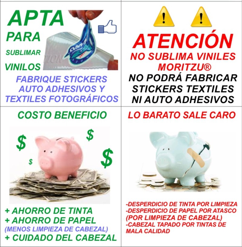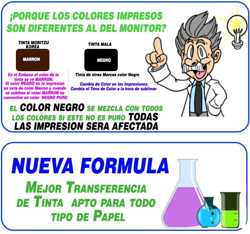 - Tinta moritzu es apta para papeles comunes, (siempre es mejor usar papel premium apto para sublipolvo, pero por cuestiones de precio puede usar papel común la cual al momento de impresión seca al instante y necesita mas tiempo para ser transferido por la sublimadora.