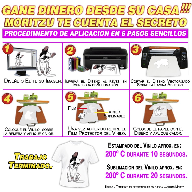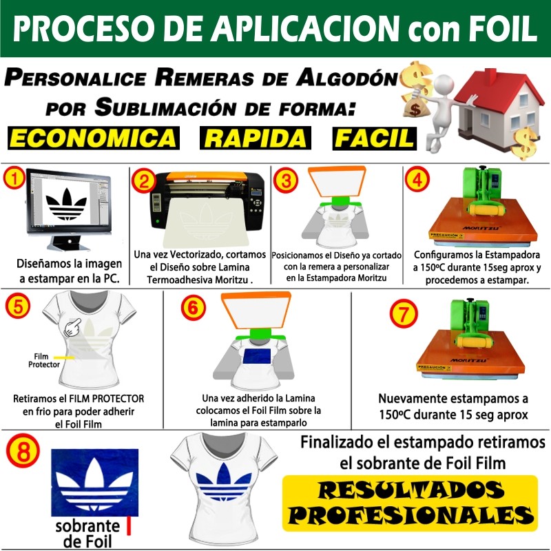 ESTAMPAR EL VINILO A 150°c x 15seg. aprox. Y LUEGO PUEDE ADHERIR FOIL, CELOFAN U OTRO PRODUCTO.